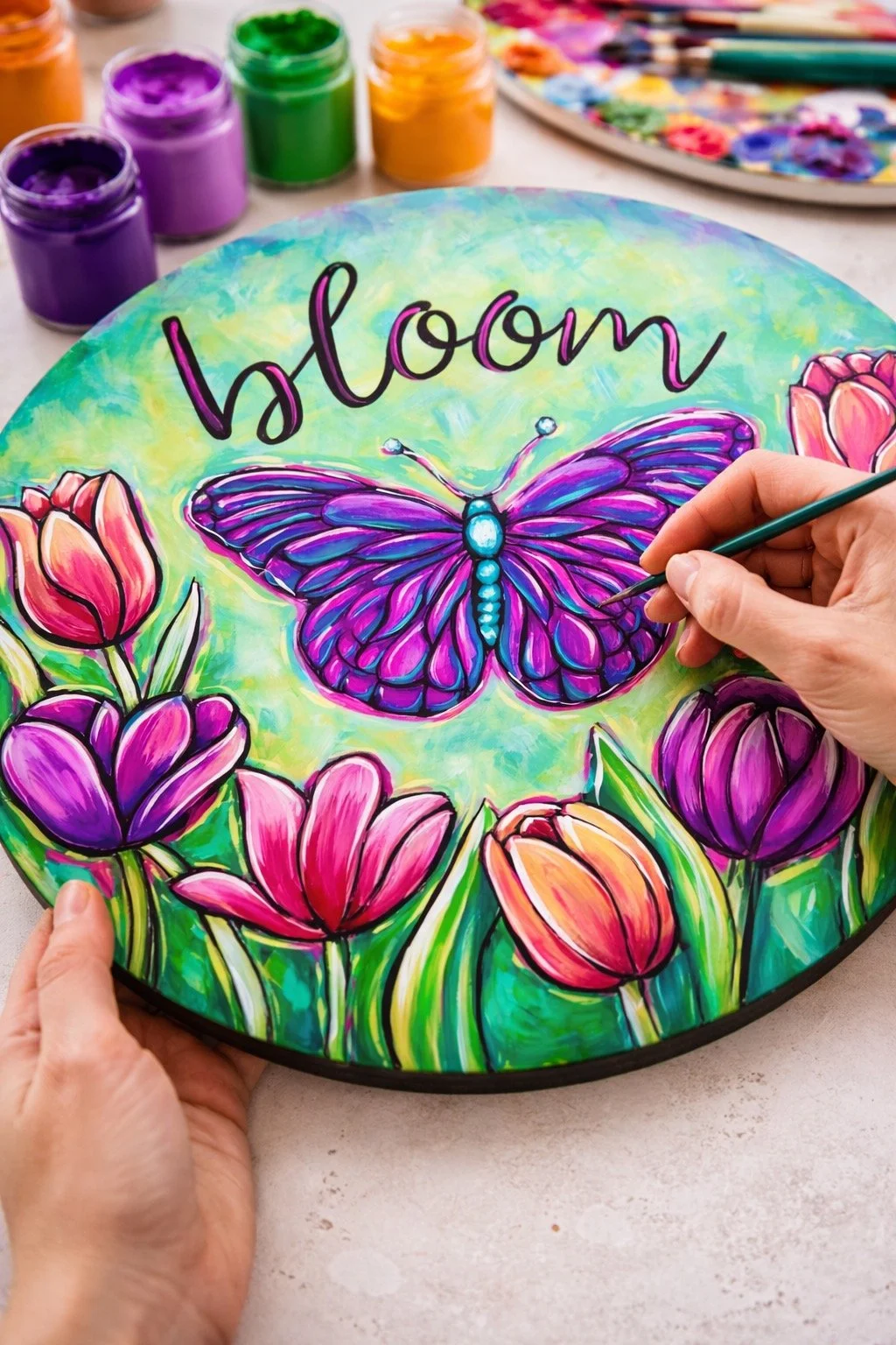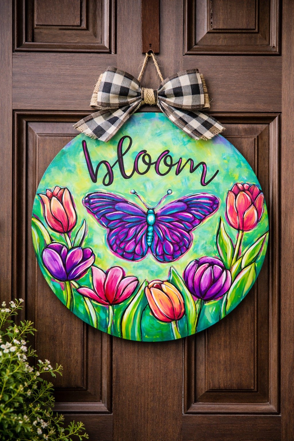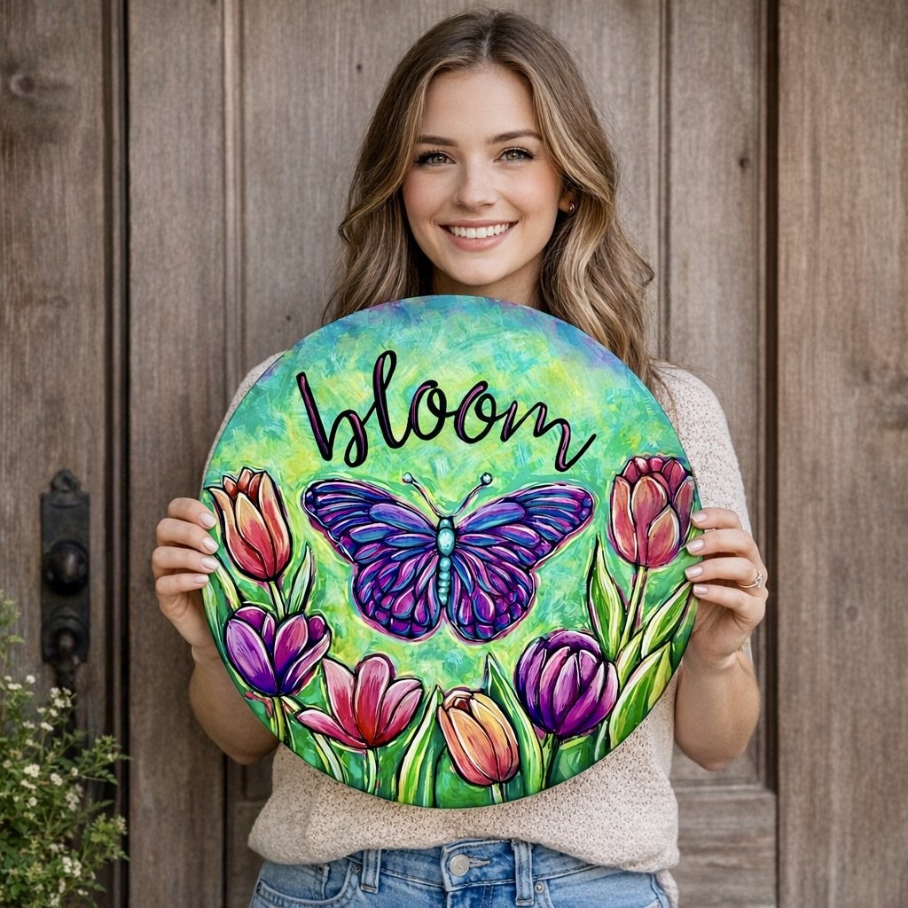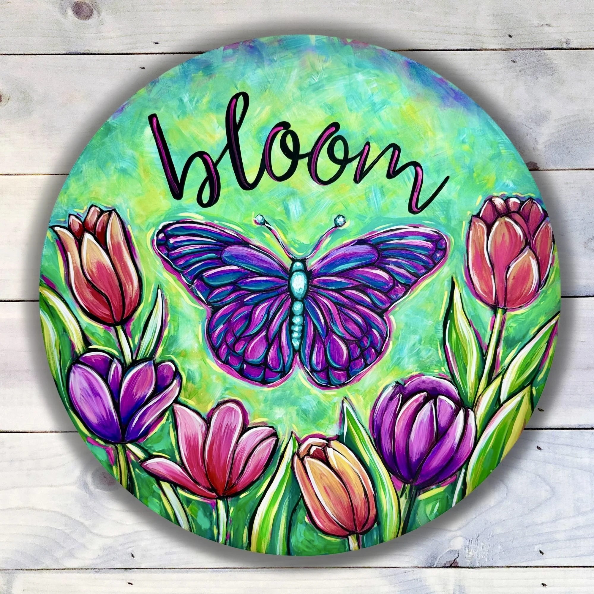 Welcome the season with bold color and joyful energy! This 18” round door hanger features a vibrant purple butterfly surrounded by tulips in rich pinks, purples, and warm coral tones — all set against a dreamy turquoise and green textured background.